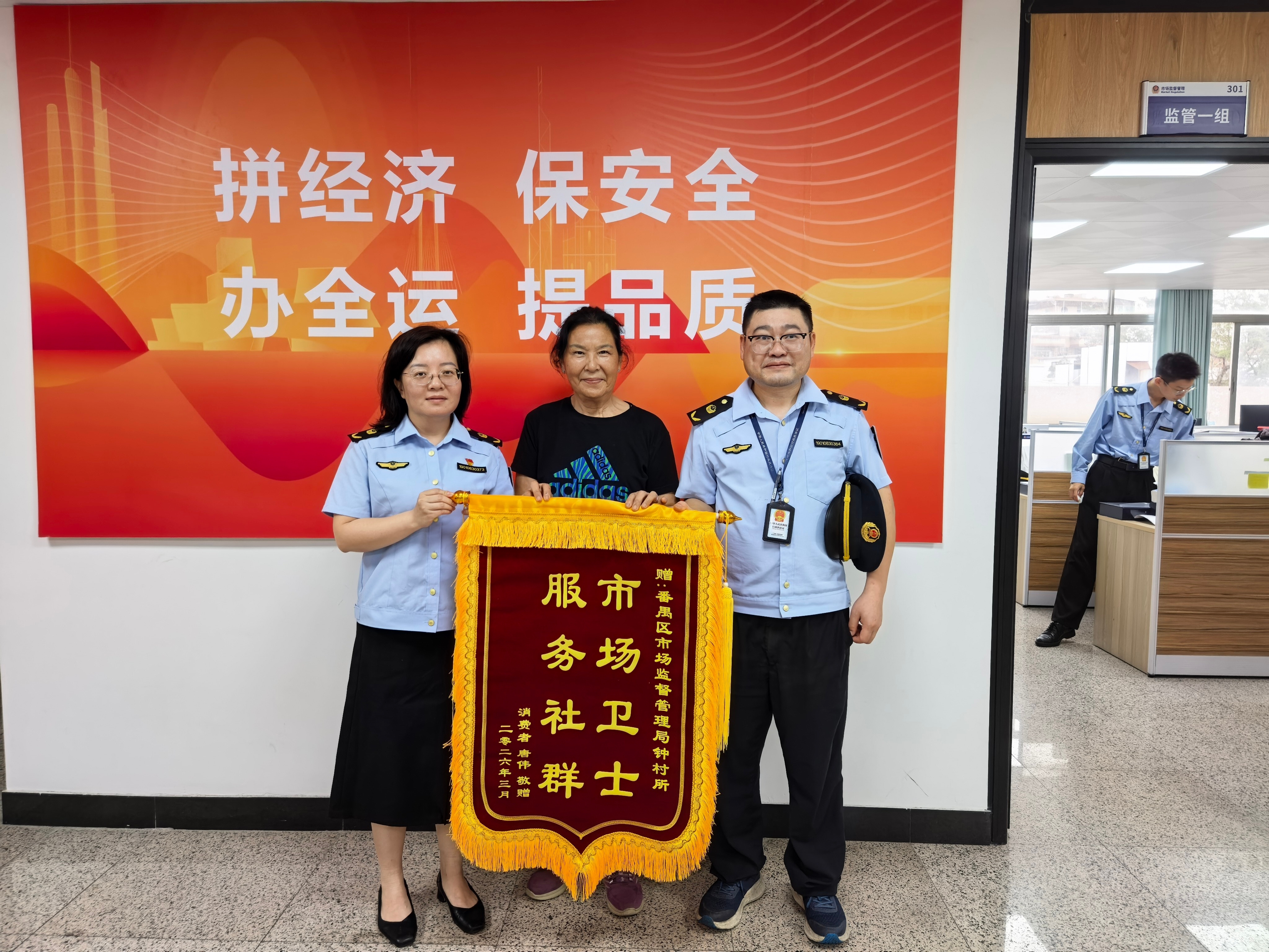 日前,市民唐女士将一面印有“市场卫士 服务社群”的锦旗,送到番禺区市场监管局钟村所,衷心感谢执法人员快速处置保健品消费陷阱、全力守护其合法权益。